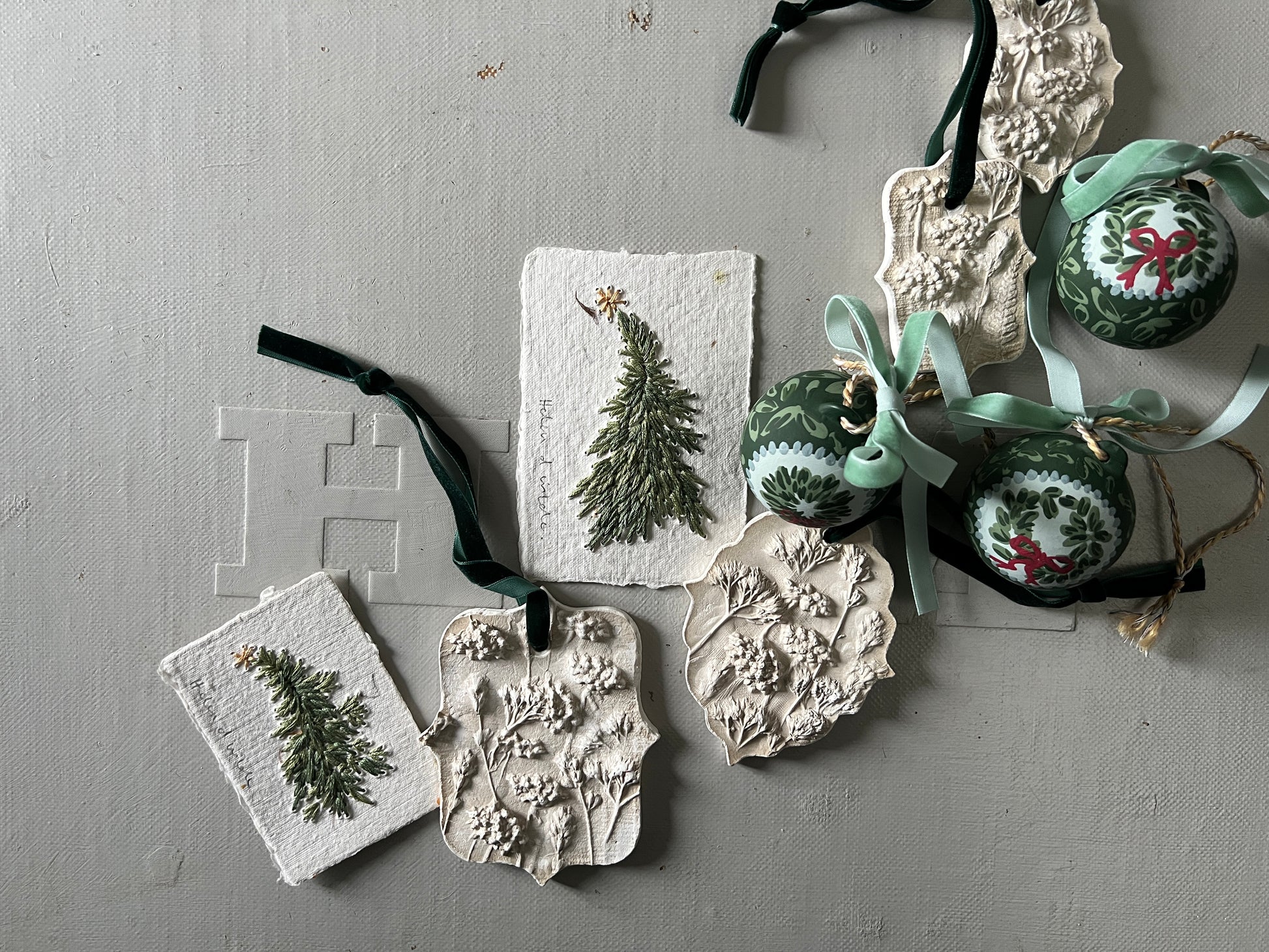 Silk embroidery on wildflower petal handmade paper, depicting a classic fir tree with a single Gold star at his crown.