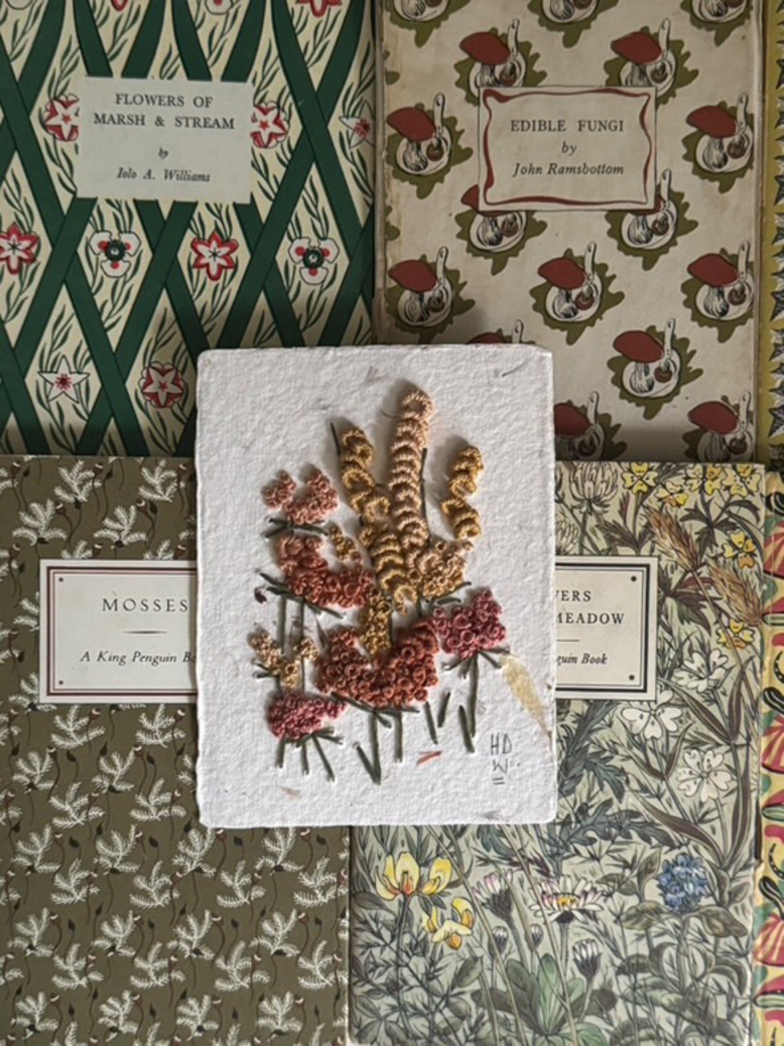 Handmade paper in a beautiful butter yellow and layered with real flower petals, it has been embroidered with various tones of yellow, orange, coral, pink and green threads;