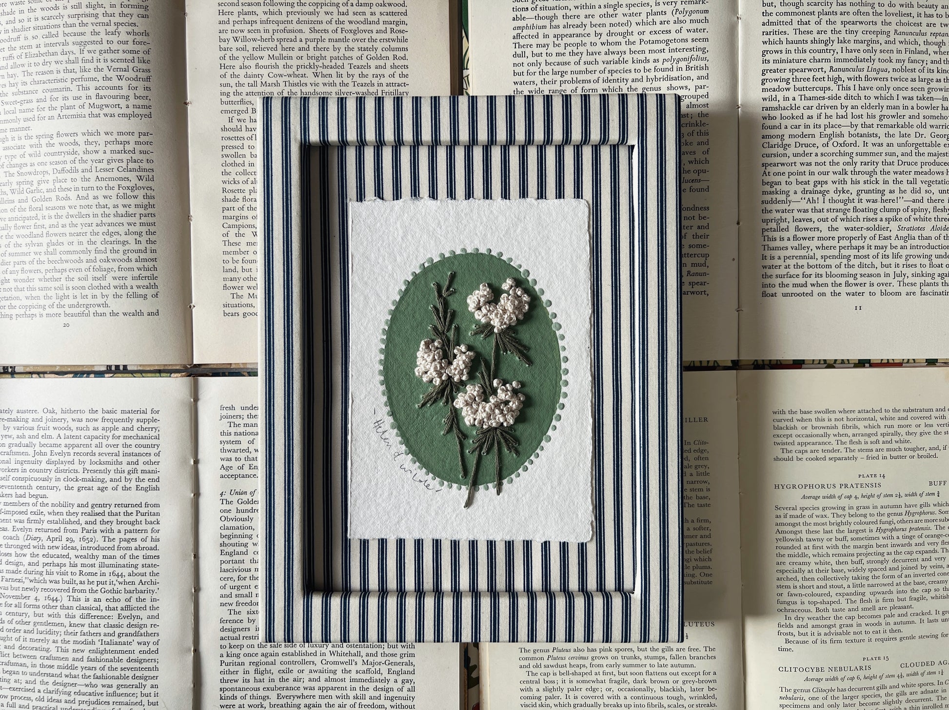 Handmade paper in a beautiful pale yellow and has been embroidered with Japanese silk thread in tones of ivory and finished with forest green cotton.
