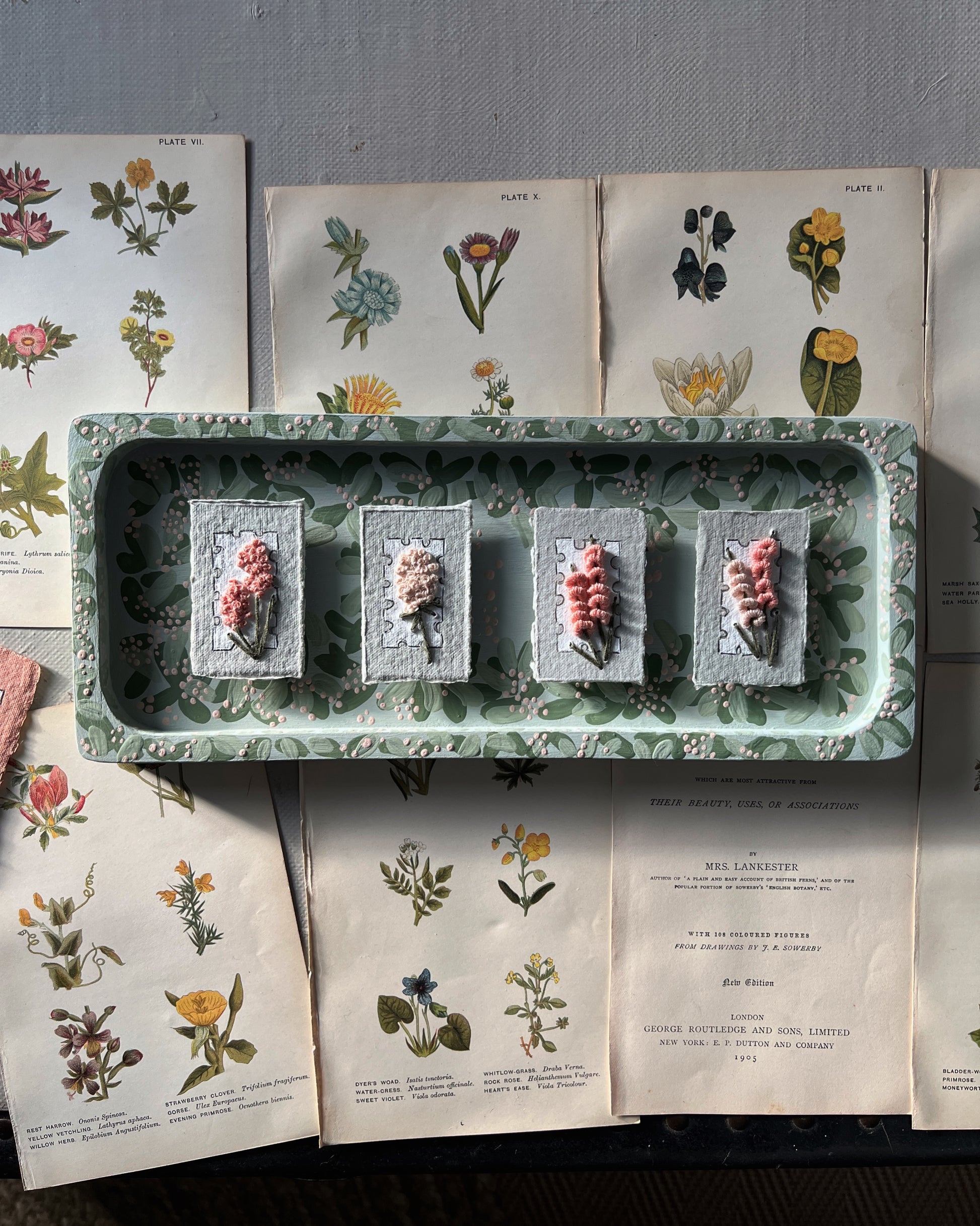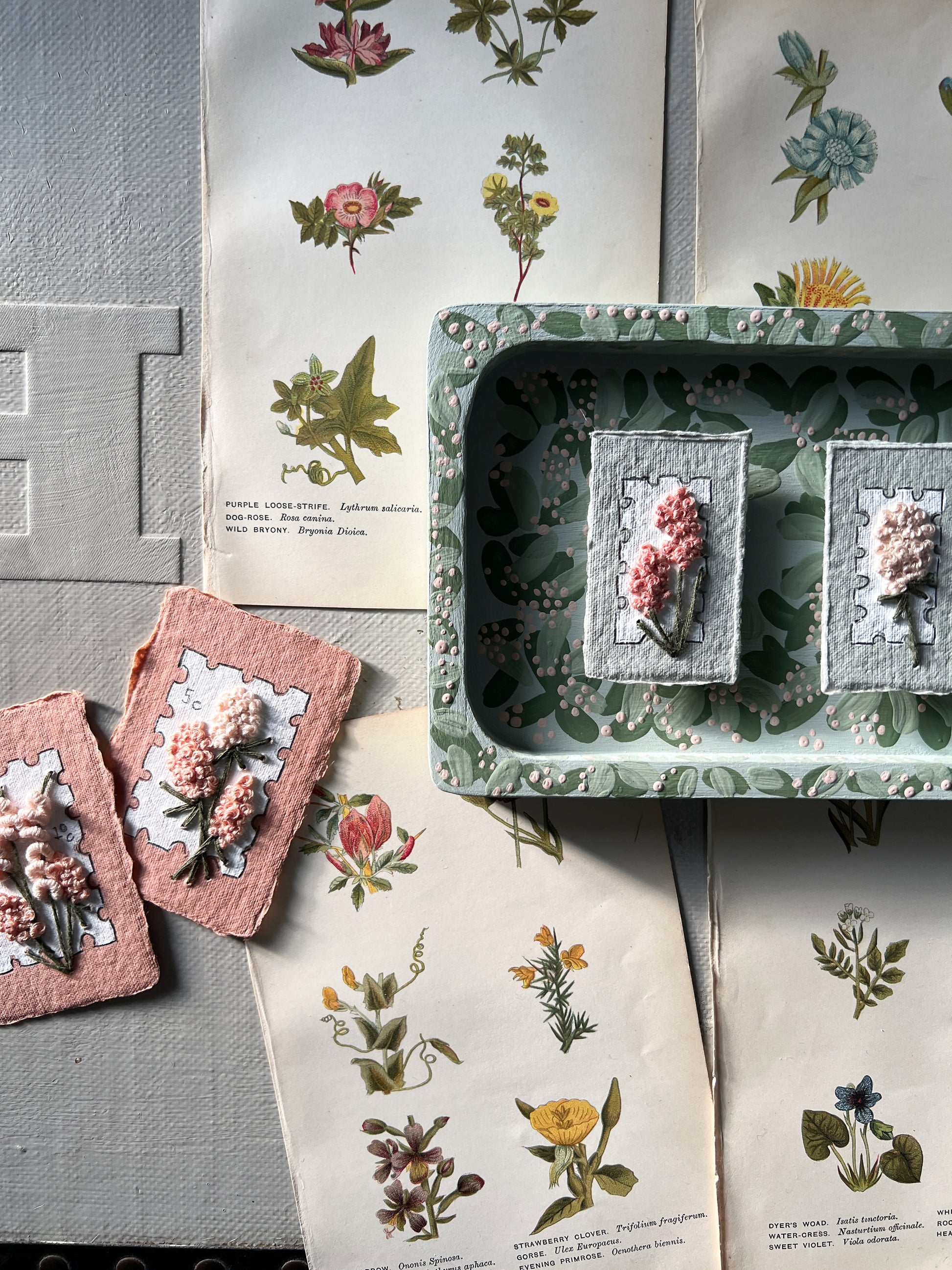 Handmade paper in a beautiful pale blue has been painted and then embroidered with Japanese silk thread in tones of pink then finished with forest green cotton.