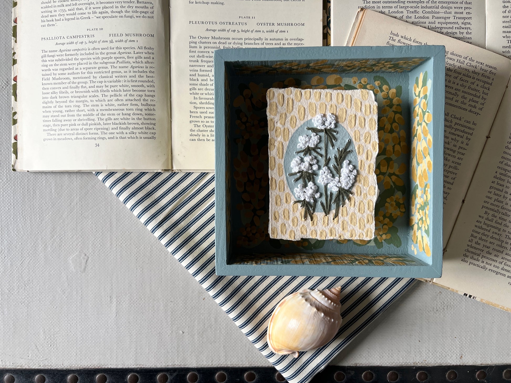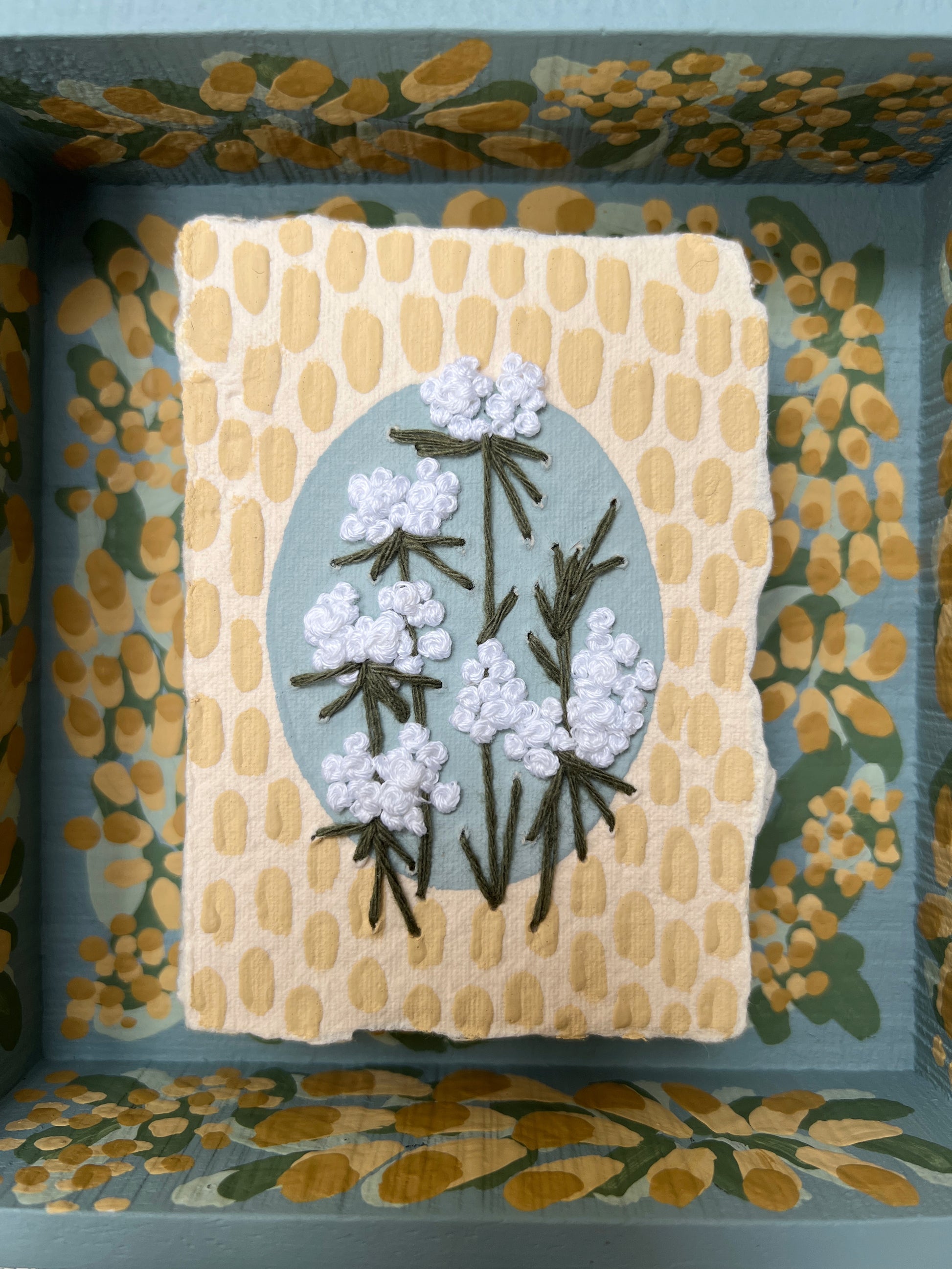 005 - Embroidered wild flowers on Handmade Paper - Framed in Yellow & Blue