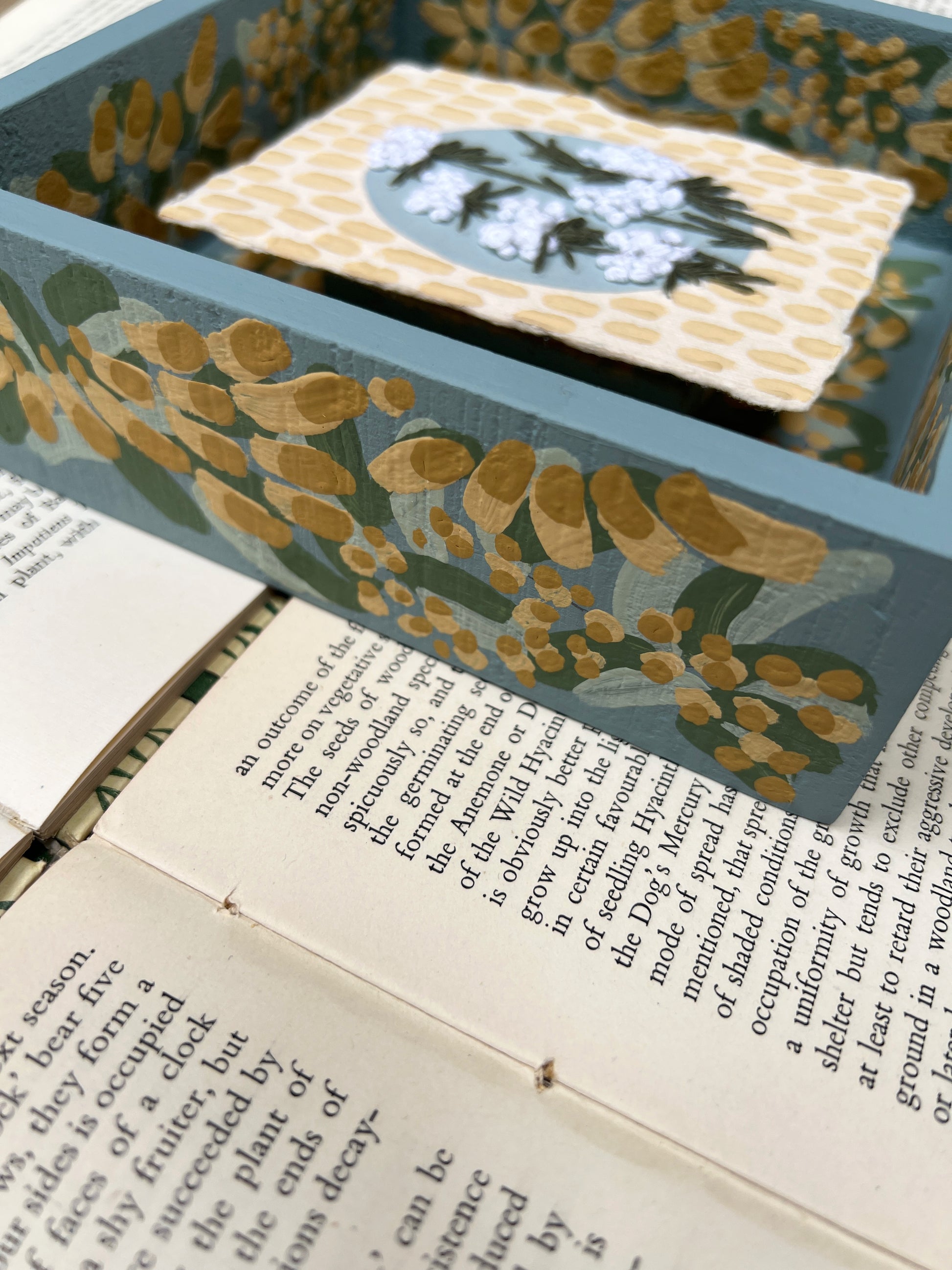 It has been framed within a hand made painted wooden frame (by me) and is ready to hang. (frame is painted around all sides inside and out with Foxgloves and yarrow)
