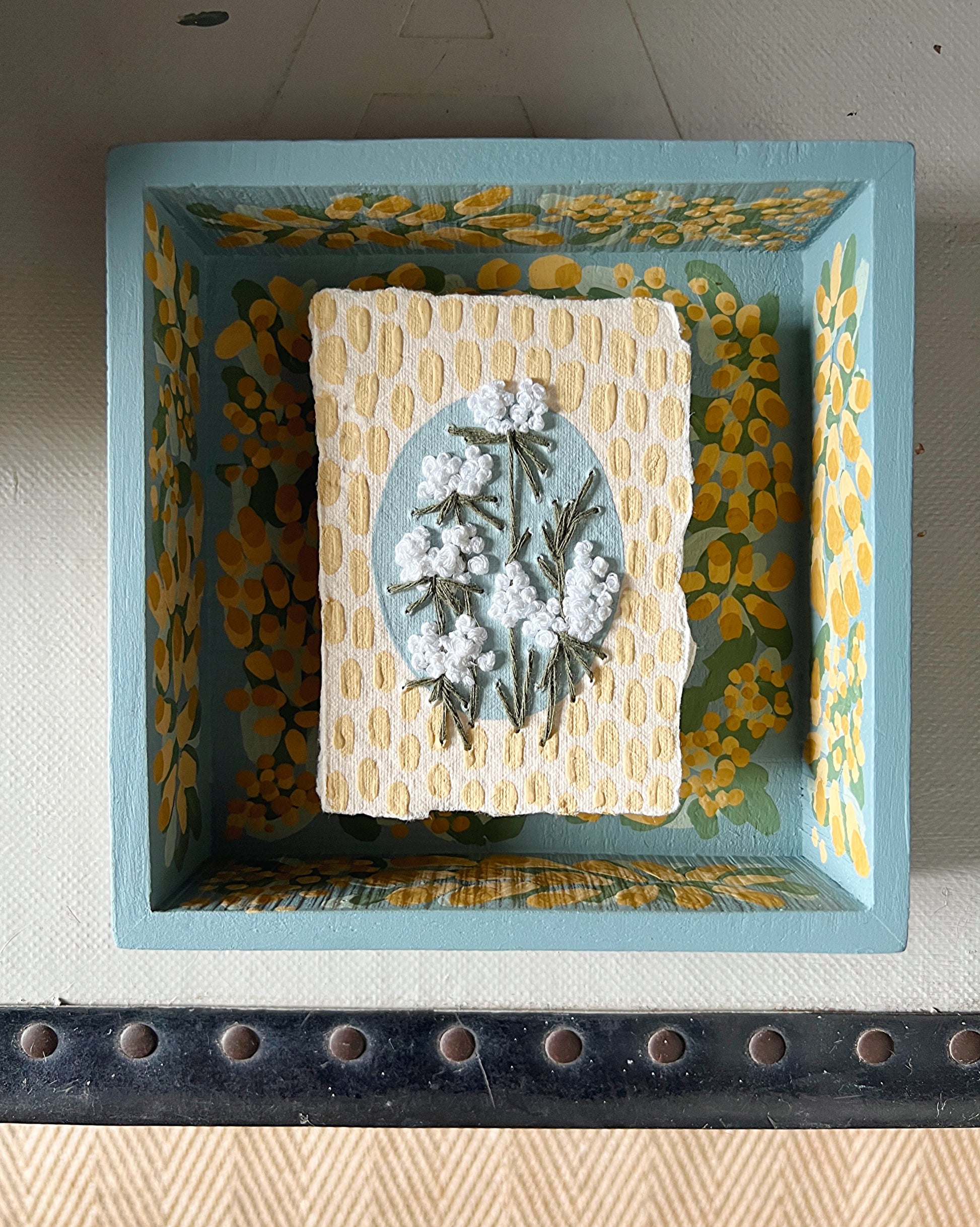Handmade paper in a beautiful pale yellow and has been painted with Farrow and Balls - "Oval Room Blue" & shades of "India Yellow" then embroidered with Japanese silk thread in white then finished with forest green cotton.