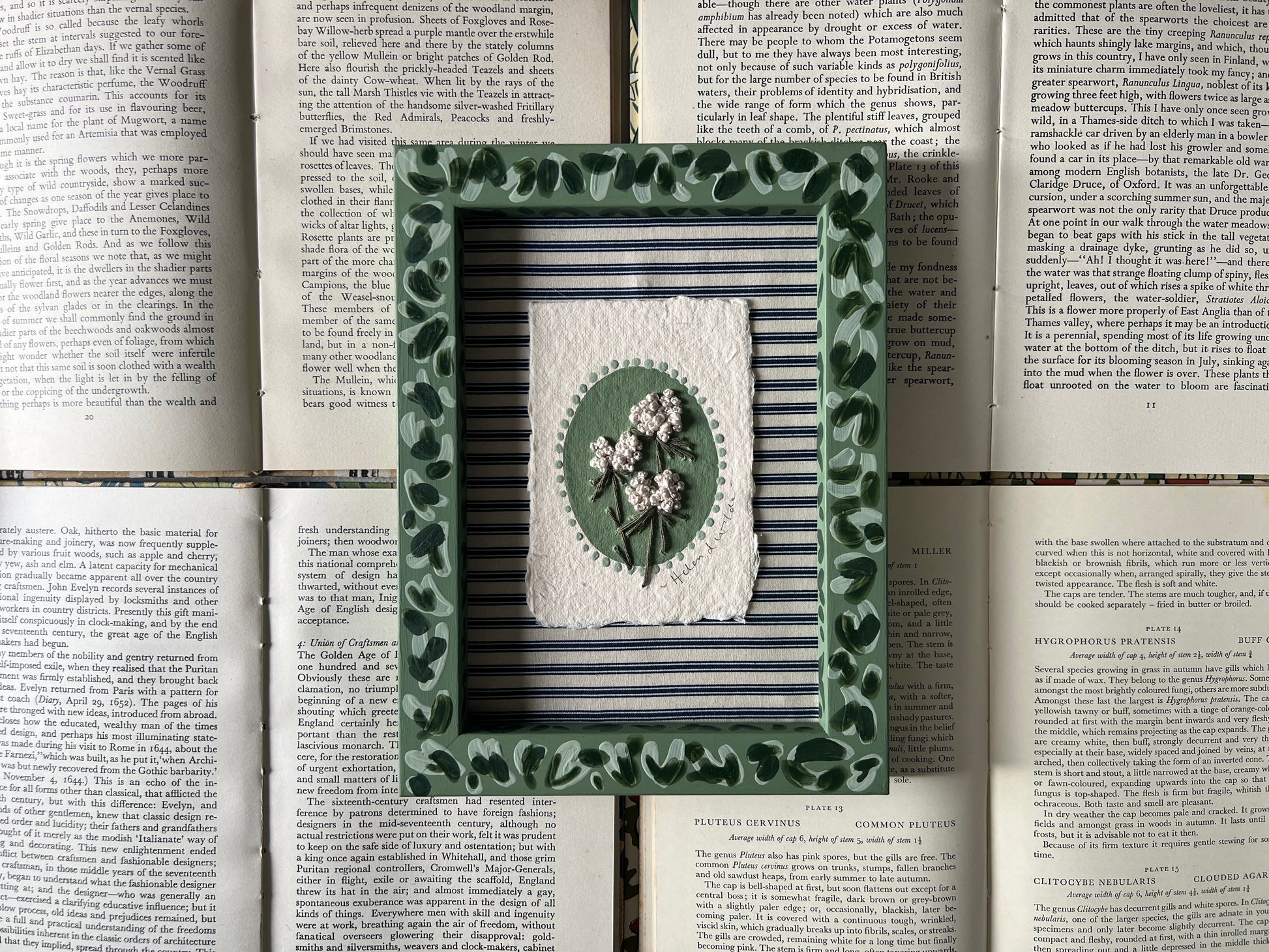 Handmade paper in a beautiful pale yellow and has been embroidered with Japanese silk thread in tones of ivory and finished with forest green cotton