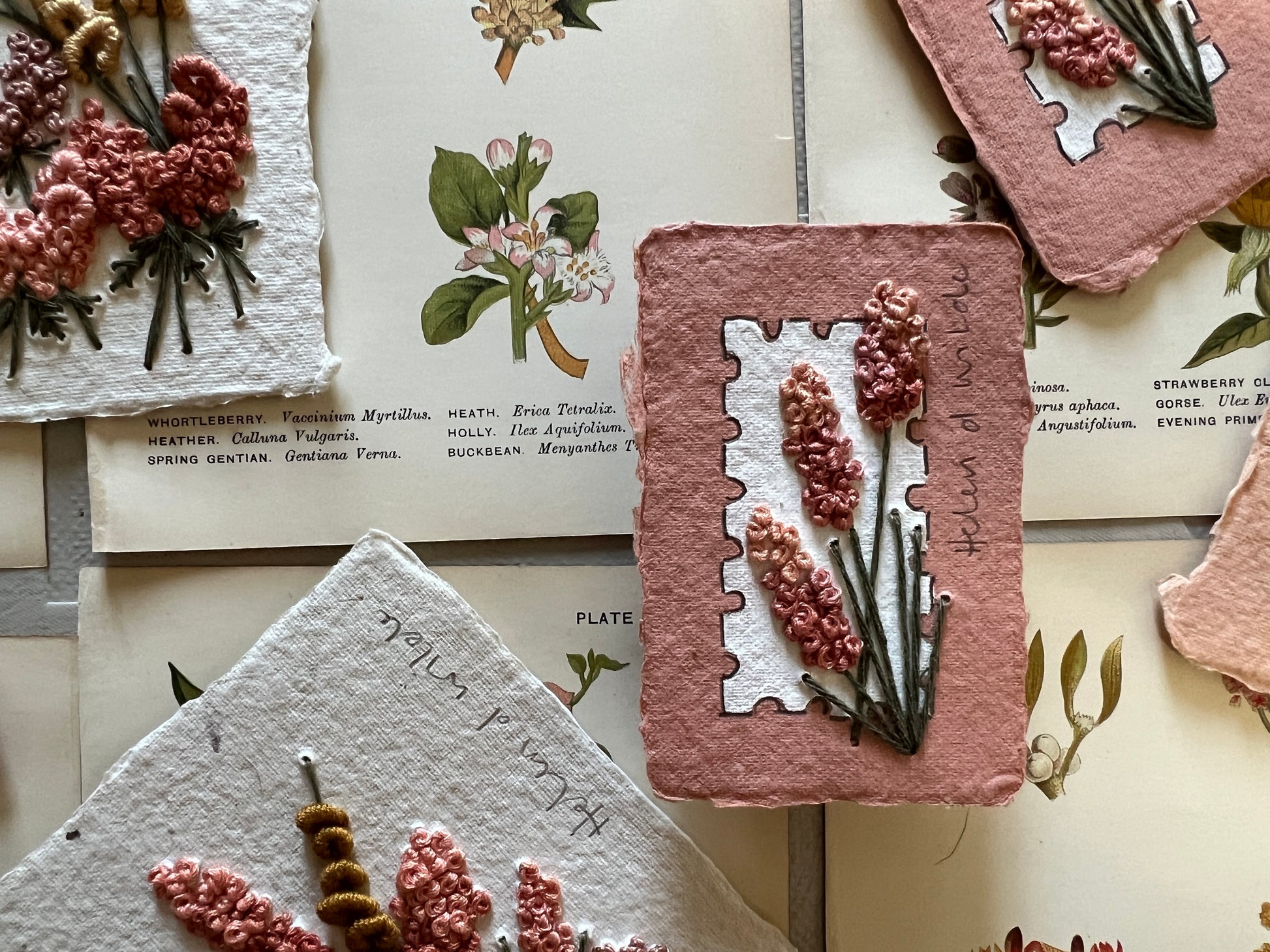 Handmade paper in a beautiful pink has been painted and then embroidered with tones of shell pink silk thread from Japan;