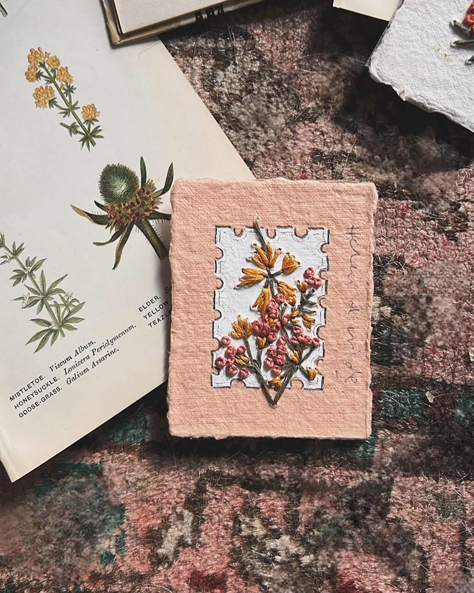 Handmade paper in a beautiful pink has been painted and then embroidered with tones of pink and yellow silk thread from Japan;